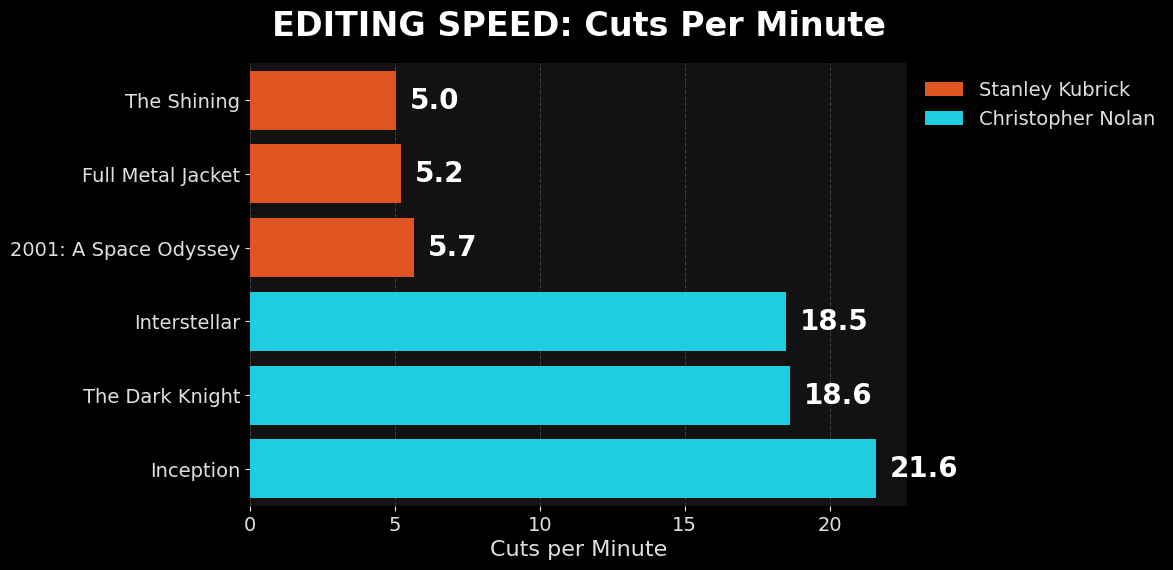 Kubrick’s Stare: With films like 2001 and The Shining, Kubrick hovers around 5 cuts per minute. This isn't just "slow"; it's hypnotic. He forces you to inhabit the frame until it becomes uncomfortable. The tension comes from not cutting.