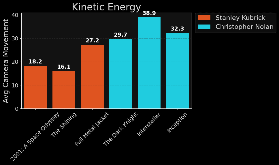 Nolan is Anxious: The data shows massive spikes in movement. His camera is handheld, floating, or chasing. He wants the viewer inside the action, experiencing the chaos subjectively.