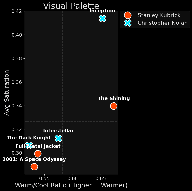 I plotted the Warmth vs. Saturation of every frame. The common criticism is that Kubrick is "cold" and "sterile," but the scatter plot tells a different story.