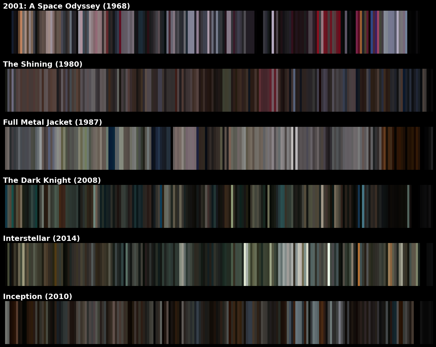 Finally, the movie barcodes (compressing frames into time-slices) reveal the architectural structure of the films.