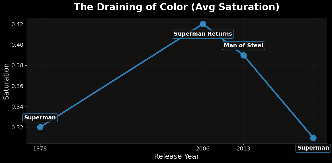 1978 wasn't the most colorful: Surprisingly, Superman Returns (2006) holds the title for highest average saturation (~0.42), likely due to its rich, heavy digital grading.