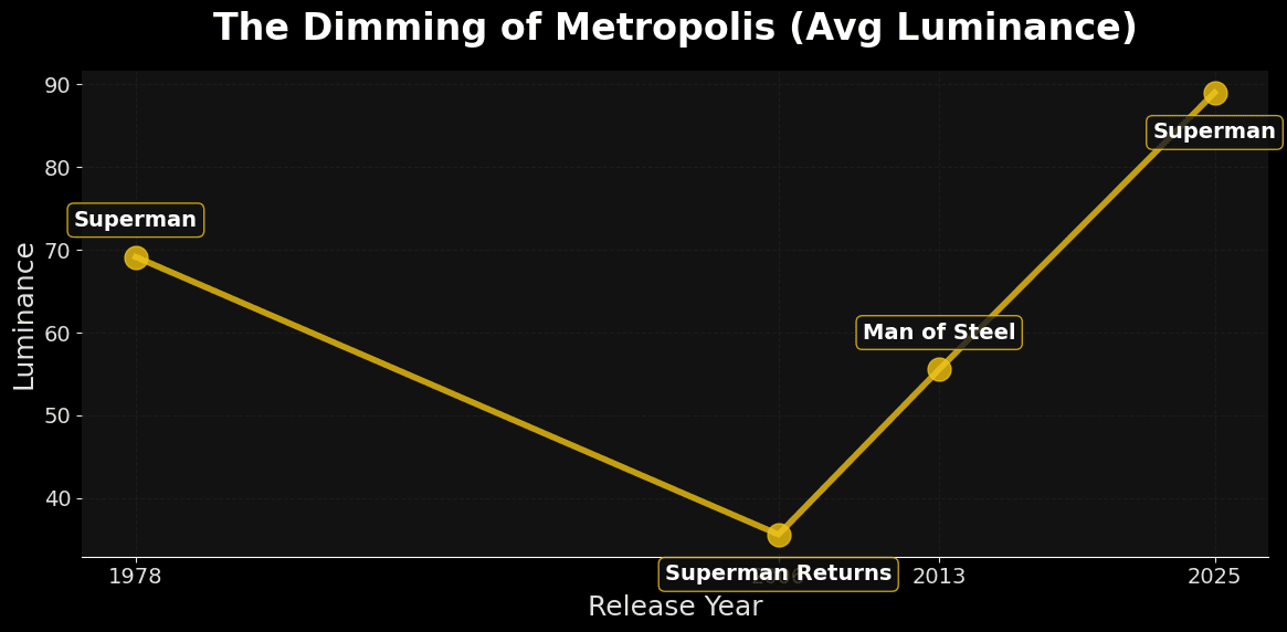 The Black Hole (2006): We tend to remember Superman Returns as a nostalgic homage, but visually? It was the darkest film in the franchise, dropping to a luminance of ~35.